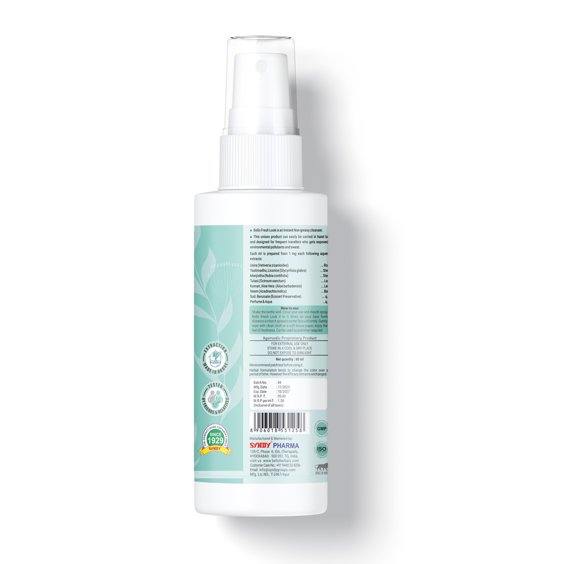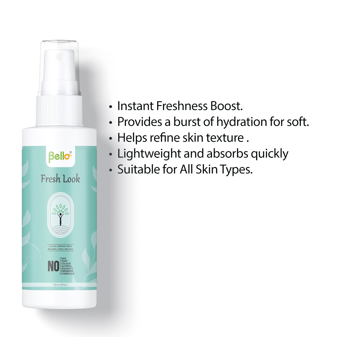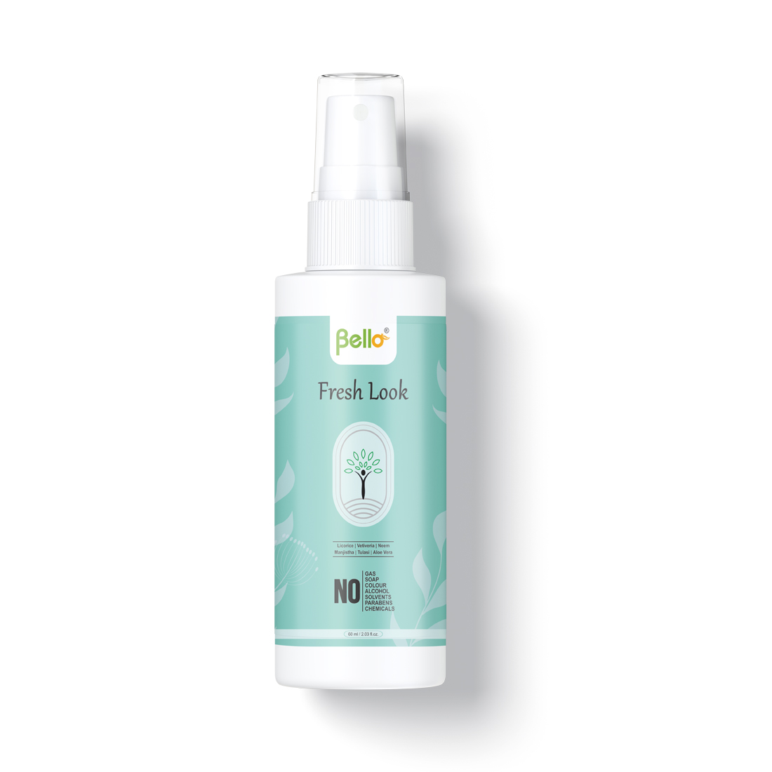 Bello Fresh Look is prepared from equal ratio of aqueous extracts of Santalum album wood (Sandal), Vetiveria zizanioides roots (Usira), Glycyrrhiza glabra stem (Yastimadhu), Rubia cordifolia Stem (Manjistha), Ocimum sanctum leaves (Tulasi), Aloe barbadensis leaves (Kumari), Azadirachta indica bark (Neem). Sod. Benzoate (as preservative) & Perfume added.